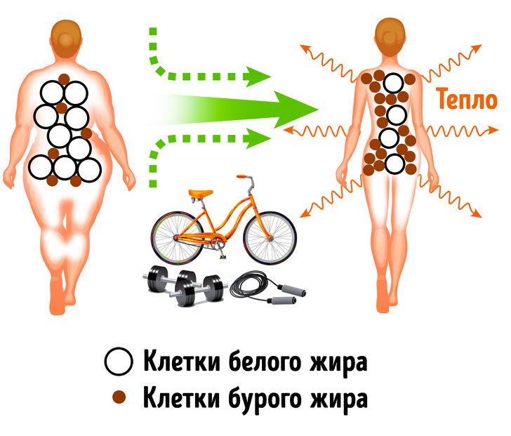 Бурый жир можно активировать тренировками. Важно только не добавлять лишних белых жировых клеток с помощью неправильного питания.