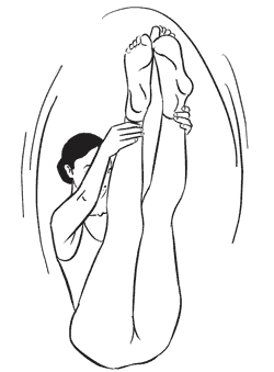 Сядьте прямо, согнув колени и поставив стопы на пол. Обхватите руками пятки и поднимите ноги вверх, широко (насколько это возможно для вас) разведя их в стороны и до конца выпрямляя колени.