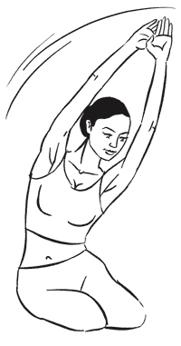 Стоя, ноги слегка согнуты в коленях, расстояние между стоп – ширина бедер, руки свободно опущены и прижаты к бедрам. На вдохе, вытягиваясь вверх, поднимите правую руку. Не поднимайте лопатки (насколько это возможно), держите расслабленными шею и плечи.
