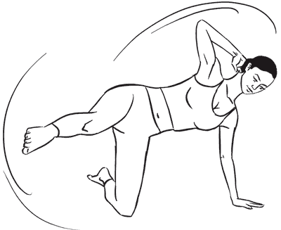 Встаньте на колени, наклонитесь влево, опираясь ладонью о пол так, чтобы запястье было под плечевым суставом, правую руку заведите за голову.
