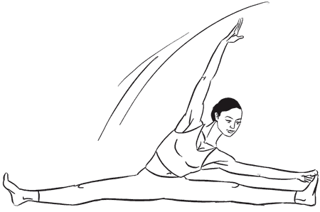 Сядьте прямо, максимально широко разведите ноги в стороны (насколько это возможно для вас). Правую руку поднимите вверх над головой, левой – обхватите большой палец левой ноги. Спина прямая, взгляд на левую руку.