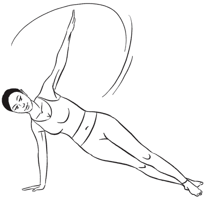 Сделайте вдох и, оттолкнувшись правой рукой, поднимите бедра, плечо должно находиться точно над запястьем. Одновременно вытяните левую руку вверх. Ваше тело должно напоминать букву «Т».