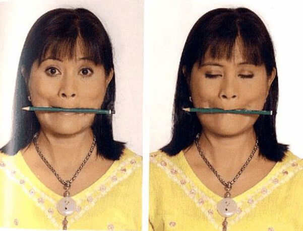 Подготовительное положение. Перед началом упражнения сделайте выдох. Затем глубоко вдохните носом, задержите дыхание на 5 секунд и сделайте медленный выдох.Вдохните и поверните губами карандаш. Одновременно с поворотом карандаша выдвиньте подбородок вперед.