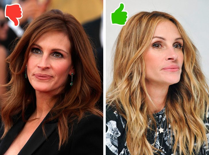 Во-первых, выбирайте теплые оттенки. Если покрасить волосы в пепельный блонд, то это скорее прибавит вам лет, чем визуально омолодит. Во-вторых, необязательно полностью осветлять волосы, достаточно добавить в прическу светлые пряди натуральных оттенков. Это поможет освежить даже теплый коричневый тон волос, который идет далеко не всем.