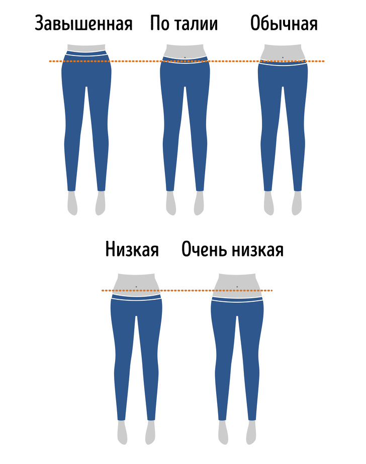 Завышенная посадка (high-wasted). Джинсы, у которых линия пояса находится на уровне пупка или чуть выше. Подобные брюки не обязательно должны быть обтягивающими — сейчас в моде так называемые «мамины джинсы». Они были популярны в 80–90-е годы, а в 2010-х их снова полюбили модницы во всем мире. Как правило, носят их с заправленной рубашкой или кроп-топами. Подобные модели хорошо вытягивают фигуру, а джинсы свободного фасона помогают скрыть небольшой животик.По талии (original). Такая посадка мало чем отличается от завышенной — верхняя линия пояса здесь проходит на уровне пупка. Носить их можно и нужно с теми же вещами, что и джинсы high-wasted: осенью и ранней весной их идеально дополнят заправленные фланелевые рубашки, пуловеры и свитеры, летом — кроп-топы, легкие блузки и классические белые рубашки.