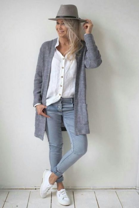 6. Брутальные черные ботинки, темные джинсы, белая свободная блузка, свободный кардиган — отличный повседневный ансамбль для зрелой женщины, которая хочет выглядеть легко и молодо.