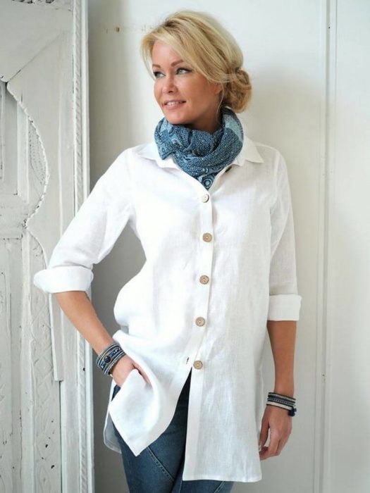 1. Белая свободная рубашка-туника великолепная базовая вещь, которая украсит любой образ в стиле casual. Отличной парой к ней станут узкие темные джинсы с подворотами.