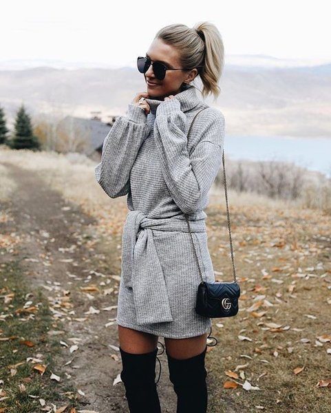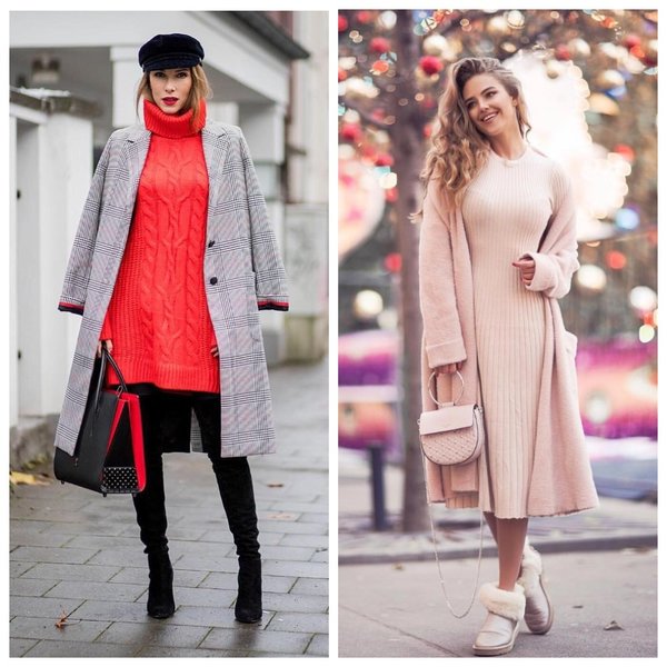 Трикотажные мини – платья помогут создать эффектный и запоминающийся образ. Выбирайте платья свободного силуэта или немного приталенные. Если вы хотите создать воздушный и нежный образ, то используйте платья, по силуэту напоминающие свитер, и высокие сапоги. Что касается цветовой гаммы, то классические цвета вне конкуренции: серый, белый и черный. Однако если вы являетесь яркой и неординарной личностью, то вам подойдут яркие оттенки, которые способны поднять настроение в холодные осенние дни. Красный, синий, ярко – розовый – выбор креативных модниц.