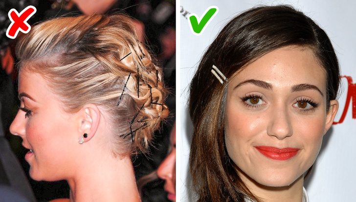 подобрать аксессуар в тон волосам и скрыть его под ними; купить яркие или нарядные невидимки и использовать их в качестве главного украшения (только не переборщите с их количеством).