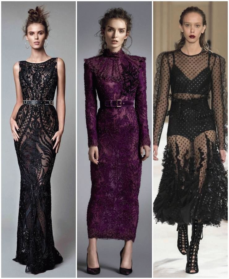 Ненамного скромнее смотрятся и кружевные платья, выполненные в виде сложной вышивки и аппликации на тонкой, почти невидимой ткани. Издали такие платья создают иллюзию боди-арта: кажется, будто узоры нарисованы на теле. При этом стратегические места прикрыты, что позволяет носить такие наряды без белья.
