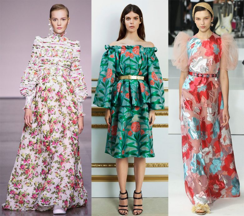 Платья с цветочным принтом будут смотреться стильно и в грядущем 2019 году. К предстоящей встрече новогоднего праздника можно приобрести комбинезон из шифона с подобным рисунком (как альтернатива платью).