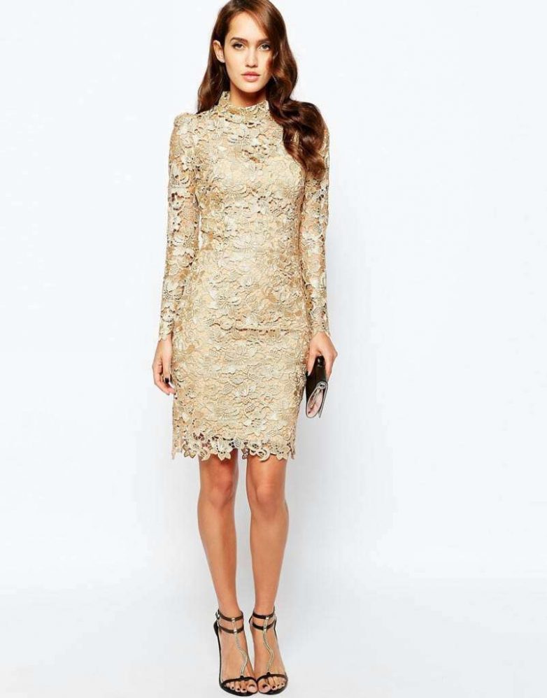 Кроме традиционных белых и черных цветов в кружевных новогодних нарядах, часто встречаются и металлические оттенки: золотистый, серебристый, медный. В сочетании с невесомыми ажурными рисунками эти цвета создают ошеломляющий эффект. В таком платье в новогоднюю ночь можно почувствовать себя Снежной Королевой или Хозяйкой Медной горы.