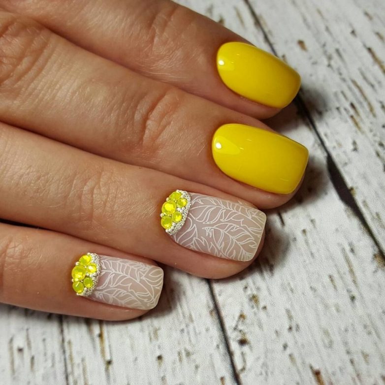 При выборе желтого оттенка, добавьте в него немного блесток золотого тона. Желтый очень хорошо сочетается с фиолетовым, коралловым, оранжевым, красным, черным. Не забудьте про стразы, бульонки, декоративный, песочек, фольгу, камни. Это же праздничный маникюр, их использование будет уместно.