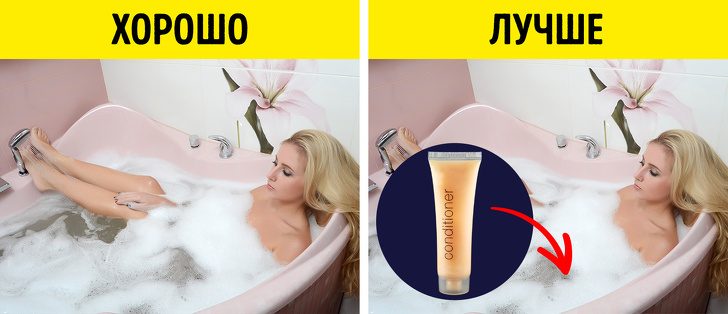 Добавьте немного кондиционера в теплую ванну: средство заменит масло, придаст приятный аромат и увлажнит вашу кожу.