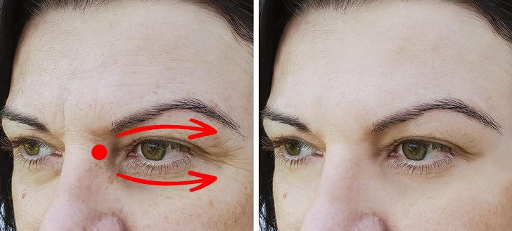 Кладем безымянные пальцы под надбровные дуги в районе переносицы и делаем разглаживающие движения по направлению к вискам. Затем перемещаем пальцы на зону под глазами и делаем разглаживающие движения от внутреннего уголка глаза к вискам. Повторяем 10 раз.