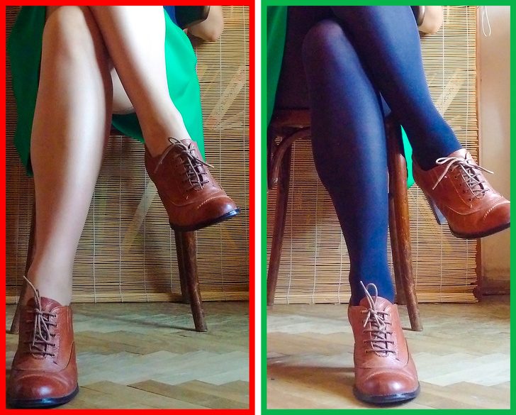 Про колготки телесного цвета не писал только ленивый, но надевать их на прогулку по Елисейским полям — это самое последнее дело. Ноги должны быть или обнаженными, или в брюках, или в колготках и чулках черного и темных цветов. Имитировать открытую кожу там, где ее на самом деле нет, — для француженок все равно что себя не уважать.