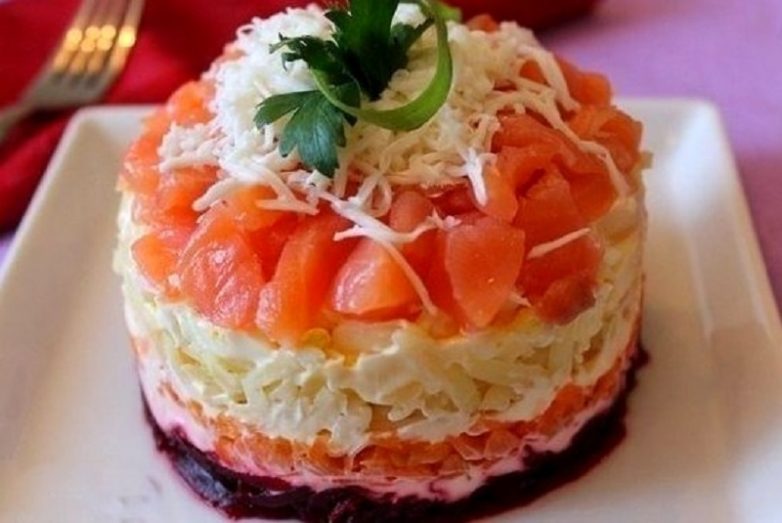 Теперь выкладываем наше блюдо по слоям. Первым будет свекла. Второй слой – это морковка. Третий – картошка, затем – яйцо и следом за ним лук. На самый вершочек нужно положить семгу. На каждый слой можете намазывать йогурт или майонез. Чтобы семга на шубе лучше пропиталась — оставьте ее на пару часов в холодильнике.