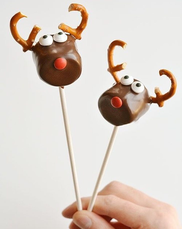Это лакомство точно понравится детям. Наденьте зефирку на палочку и обмакните в шоколад, с помощью цветных драже сделайте оленю глазки и носик, а из соленого крекера — рога. Поставьте в холодильник, чтобы шоколад застыл.