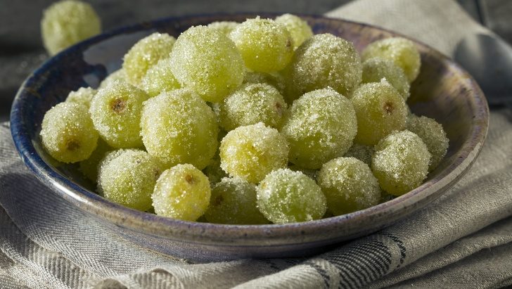 Приготовление этого легкого и освежающего десерта не отнимет у вас много времени. Вам понадобятся: виноград, 2 ст. л. сахара и 2 стакана белого сухого вина. Смешайте виноград с вином и сахаром, залейте в банку и закройте крышкой. Поставьте в холодильник на ночь — за это время ягоды впитают алкоголь. Затем достаньте виноградины, обваляйте в сахаре и поставьте еще на пару часов в морозильник.