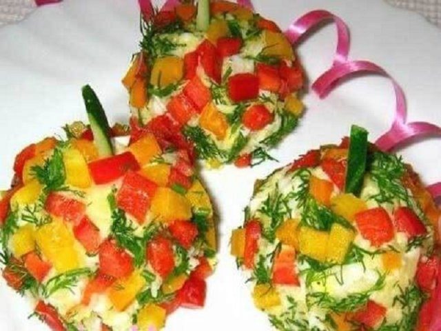 Приготовление. Отварите яйца и картофель, очистите их. Все ингредиенты (кроме перца) нарежьте кубиками, посолите и заправьте майонезом. Перец также нарежьте кубиками, но в отдельной посуде, смешайте с рубленой зеленью. Сформируйте из смеси копченой курицы, яиц и картофеля шарики и обваляйте их в болгарском перце.