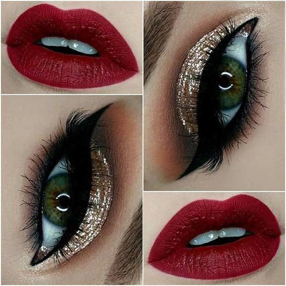 Если вы хотите почувствовать себя королевой на официальном мероприятии, то смело выбирайте такое сочетание. В этой паре акцент больше идет на губы, но и глаза тоже не отстают. Золотой мерцающий оттенок манит за собой. А от нежно красных губ невозможно оторвать взгляд.