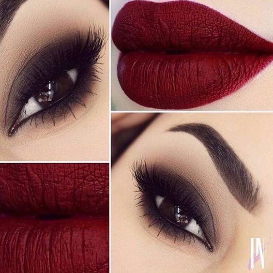 Такое сочетание подходит для вечернего макияжа. Насыщенный бордовый оттенок сделает образ более дорогим, а интересный серо-коричневый цвет отлично оттеняет губы. В этой комбинации акцент создается именно на них.