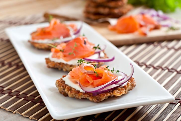 Оладушки мажем сверху сметаной, кладем немного нарезанного полукольцами красного лука и кусочки рыбы.