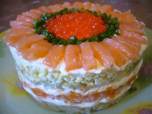 Данный салат будет украшением вашего стола. Все продукты выкладываются слоями, а каждый слой промазывается майонезом.