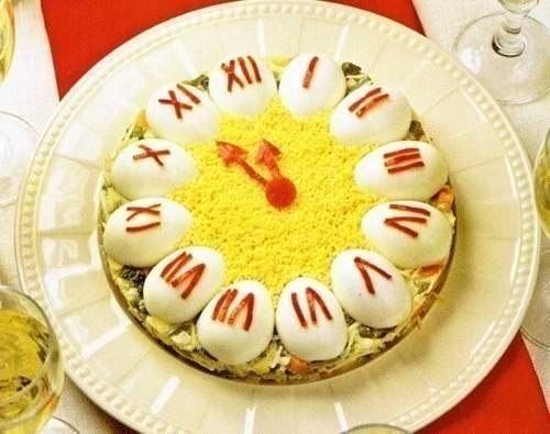 Из красного перца вырезаем стрелки наших часов: большую — часовую и длинную тонкую — минутную. Так же, из перца вырезаем полосочки из римских цифр. Чтобы вся красота у вас не отвалилась, предварительно смазываем поверхность яиц майонезом, он будет выступать в роли клея, и выкладываем на белки римские цифры из перца. Стрелки на часах выкладываем таким образом, чтобы было без пяти двенадцать.