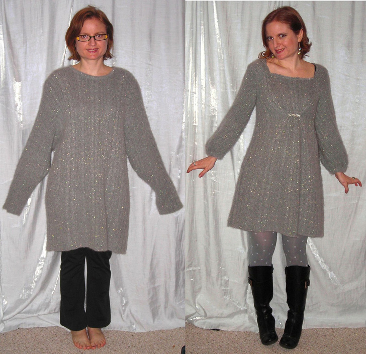 Не спешите выбрасывать старый растянутый свитер: его легко можно трансформировать в зимнее платьице.