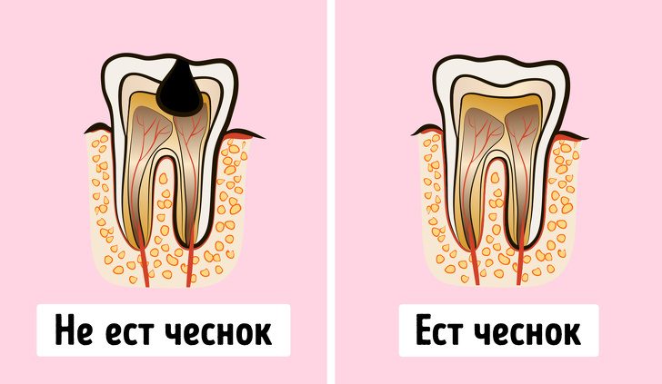 Благодаря своим антибактериальным и антигрибковым свойствам чеснок полезен для полости рта. Он убивает вредные микробы, из-за которых образуются отложения, и лечит воспаленные десны. А еще этот полезный продукт снижает риск кариеса. Если вы будете регулярно есть чеснок, то видеться со стоматологом придется реже.