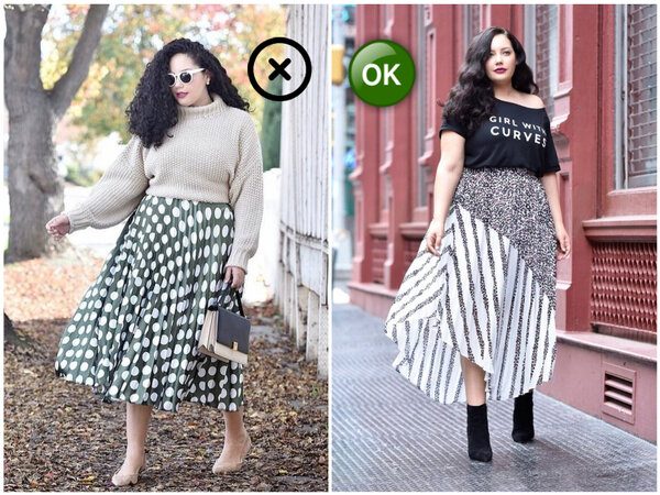 Мелкий принт и вертикальная полоса — стройнит, крупный горох — полнит.