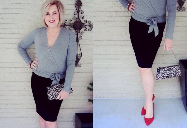 Серый скучный? Нет, конечно, если в образ добавить яркие оттенки: помада, сумочка и туфли. И фигура в данном случае не стандартна, но это не делает образ менее эффектным.