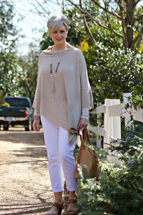 В объемном свитере можно отправиться и на прогулку в парк с внуками, и в кафе с подругами, и в интересную поездку. С помощью остальных предметов наряда и аксессуаров можно создавать образы на все случаи жизни.
