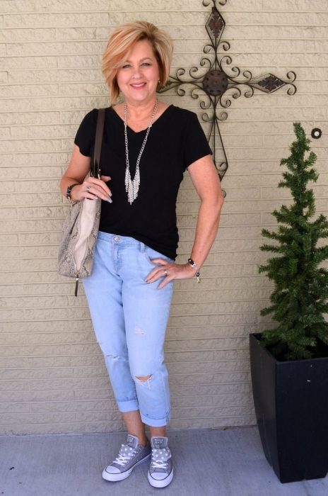 Стилисты советуют иметь в гардеробе базовую хлопковую футболку. Желательно белую и черную. Рекомендуется выбирать свободные модели: они смотрятся более стильно и скрывают недочеты фигуры.