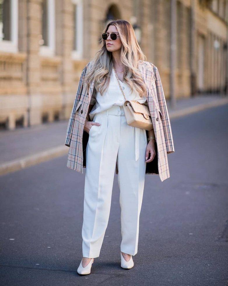 Если ты ищешь белые брюки, то paperbag — лучшее решение. Они свободны, поэтому не будут парить или подчеркивать недостатки фигуры. А также их легко сочетать с укороченными топами и легкими блузами.