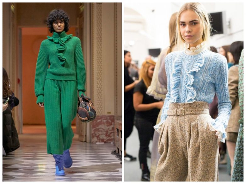 Если до сегодня рюши воланы у вас ассоциировались исключительно с блузами, то приготовьтесь открыть для себя эти элементы и в вязаных кофтах! Вариации, предложенные дизайнерами, сами по себе не являются революционными – это милые манишки с рюшами, оторочка рюшами на рукавах и горловине.Революционным же является использование этих элементов в трикотаже, материале, который, казалось бы, не очень ассоциируется с лёгкостью и воздушностью. На удивление, такое решение стало не просто оригинальным, но уместным и стильным. Предложенные вариации сразу покорили модниц, и мы уверены, что кофта с рюшами должна появиться и в вашем гардеробе.