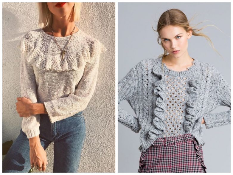 Революционным же является использование этих элементов в трикотаже, материале, который, казалось бы, не очень ассоциируется с лёгкостью и воздушностью. На удивление, такое решение стало не просто оригинальным, но уместным и стильным. Предложенные вариации сразу покорили модниц, и мы уверены, что кофта с рюшами должна появиться и в вашем гардеробе.