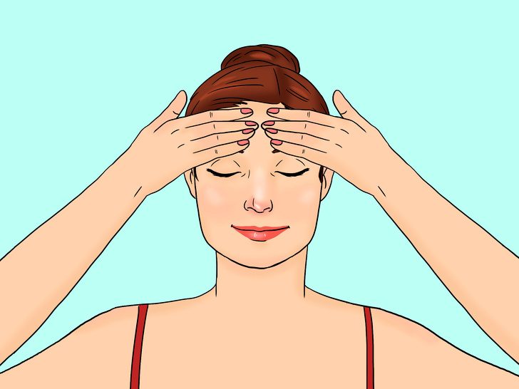Голова чуть отклонена назад. Фалангами пальцев нажимаем на лоб рядом с границей с волосами. Далее аналогичным образом надавливаем на область ближе к вискам. Двигаемся по линии роста волос до мочек ушей. Затем несильно проводим пальцами вниз по шее до ключиц.