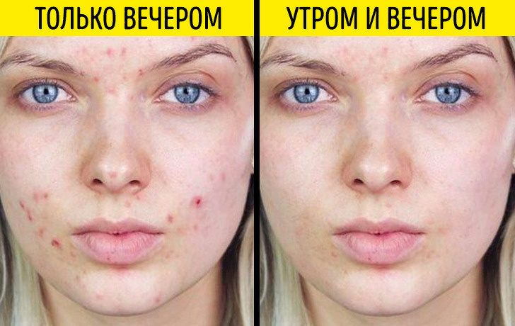 Очищающие средства принесут куда большую пользу коже, если их использовать не только вечером, для снятия макияжа, но и утром. Так мы смоем себум, ороговевшие частички кожи, пот и загрязнения, которые проникли в кожу с наволочки за ночь. Также лучше полностью отказаться от скрабов в пользу средств для умывания и щадящих средств с кислотами, так как агрессивное очищение наносит коже травмы.