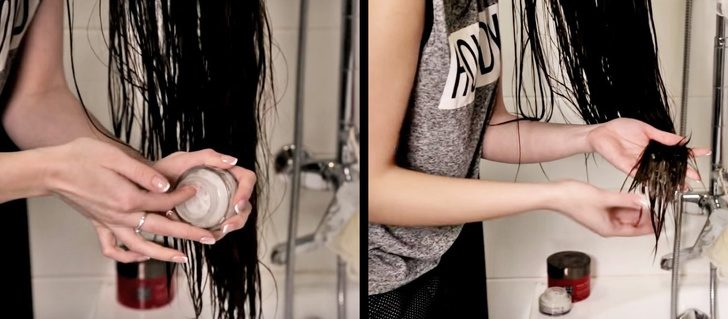 Если у вас волосы сухие на концах, то перед мытьем головы на кончики волос нанесите бальзам или кокосовое масло. После это можно начинать процедуру мытья: на корни волос добавьте шампунь, а образовавшуюся пену распределите по всей длине. Затем смойте все теплой водой. Суть в том, что бальзам или масло не дадут шампуню агрессивно воздействовать на кончики волос и те будут более эластичными.