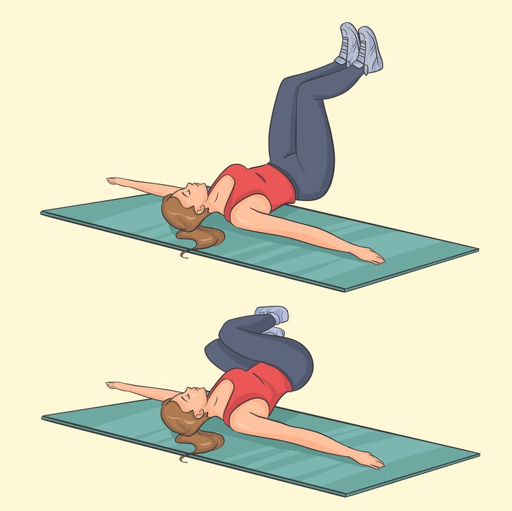 Исходное положение: лягте на спину на коврик и расположите руки вдоль тела для поддержки. Колени согните под углом 90 °.