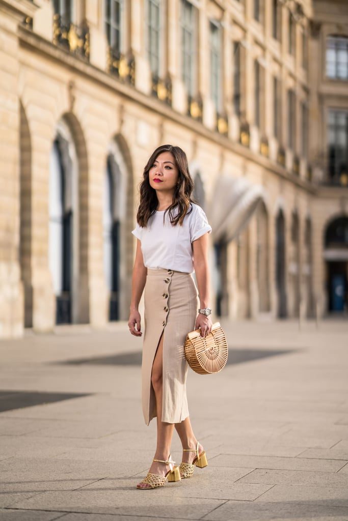 Заправьте белую футболку в юбку-миди и завершите образ деревянной сумкой и босоножками.