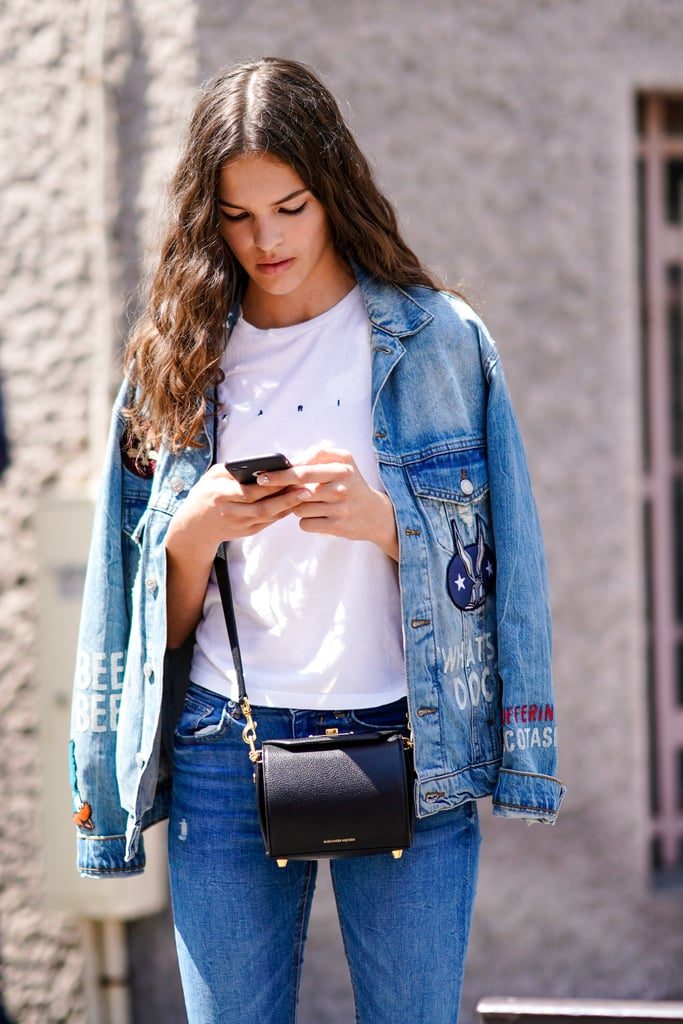 Джинсовый образ с головы до ног легко носить поверх белой футболки.