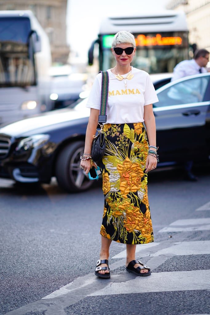 Футболка с надписью — это забавно. Добавьте к ней юбку-миди с необычным принтом.