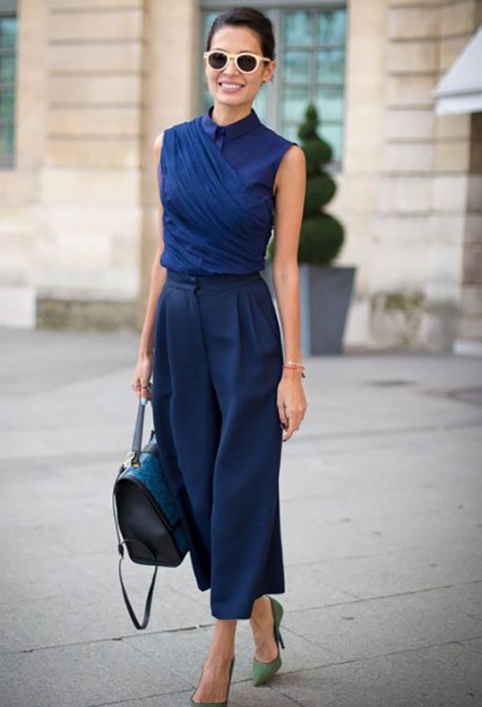 Если ты предпочитаешь брюки с широким кроем, характерным для «пижамных» вариантов, обрати внимание на материал. Предпочтение лучше отдавать плотной ткани. Комбинируй свой образ с приталенным верхом и туфлями на высоком каблуке.
