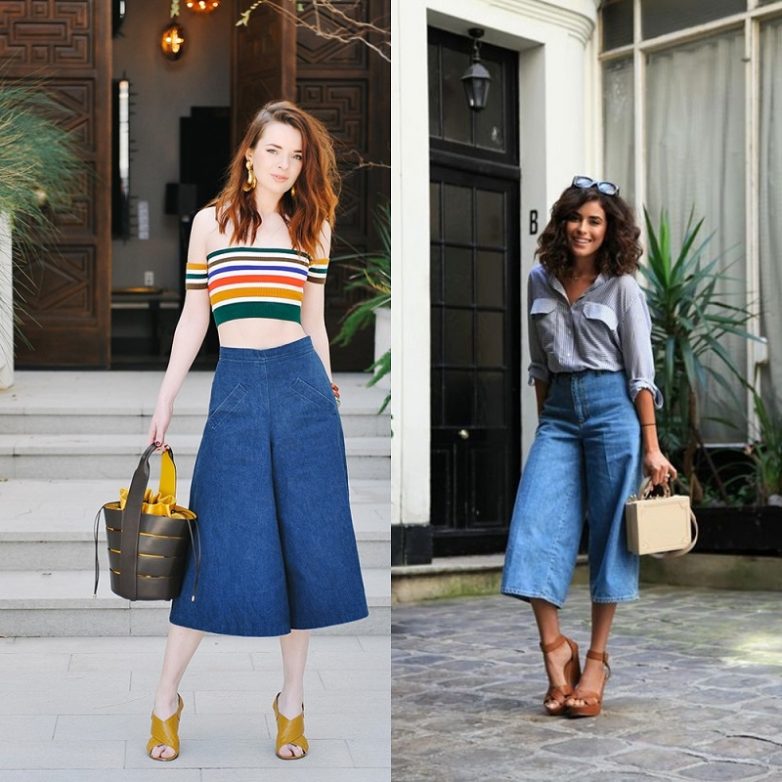 В этом году модно носить вещи из денима, и кюлоты не исключение. Такую модель брюк лучше выбирать без потертостей и рванины. Так их будет легче сочетать с другими вещами.