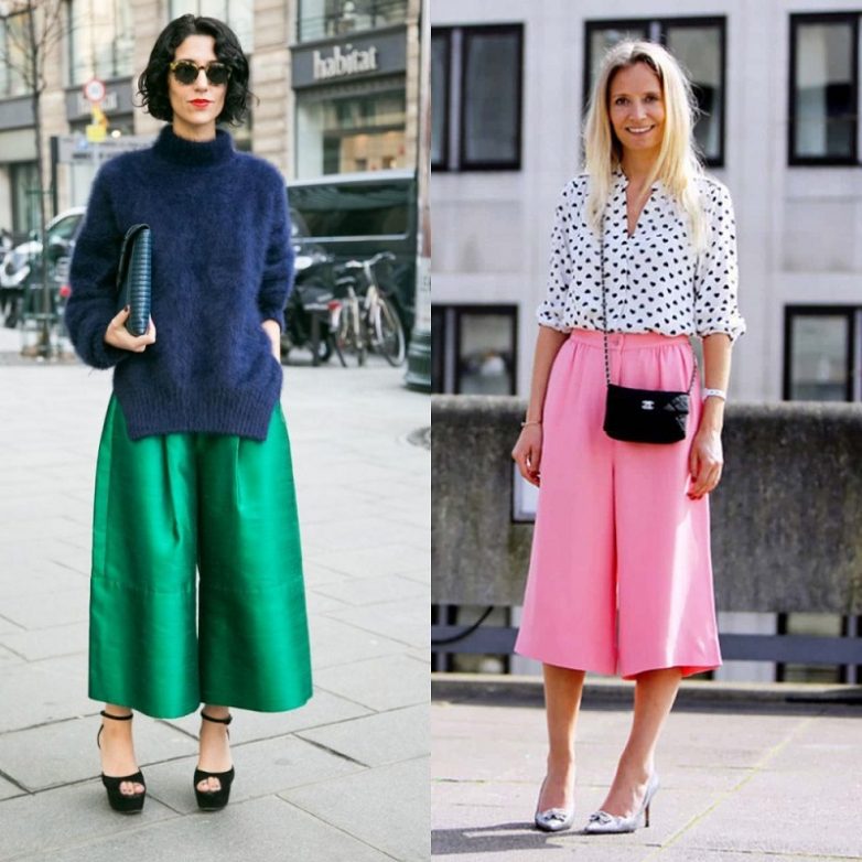 Универсальность этой модели брюк проявляется и в ее стилистике. Все зависит от того, с чем ты наденшь кюлоты. Это наглядно демонстрируют примеры выше: самые известные героини уличной моды носят кюлоты «и в пир, и в мир». К тому же кюлоты будут в моде еще не один сезон, ведь четко просматривается тенденция свободных брюк.