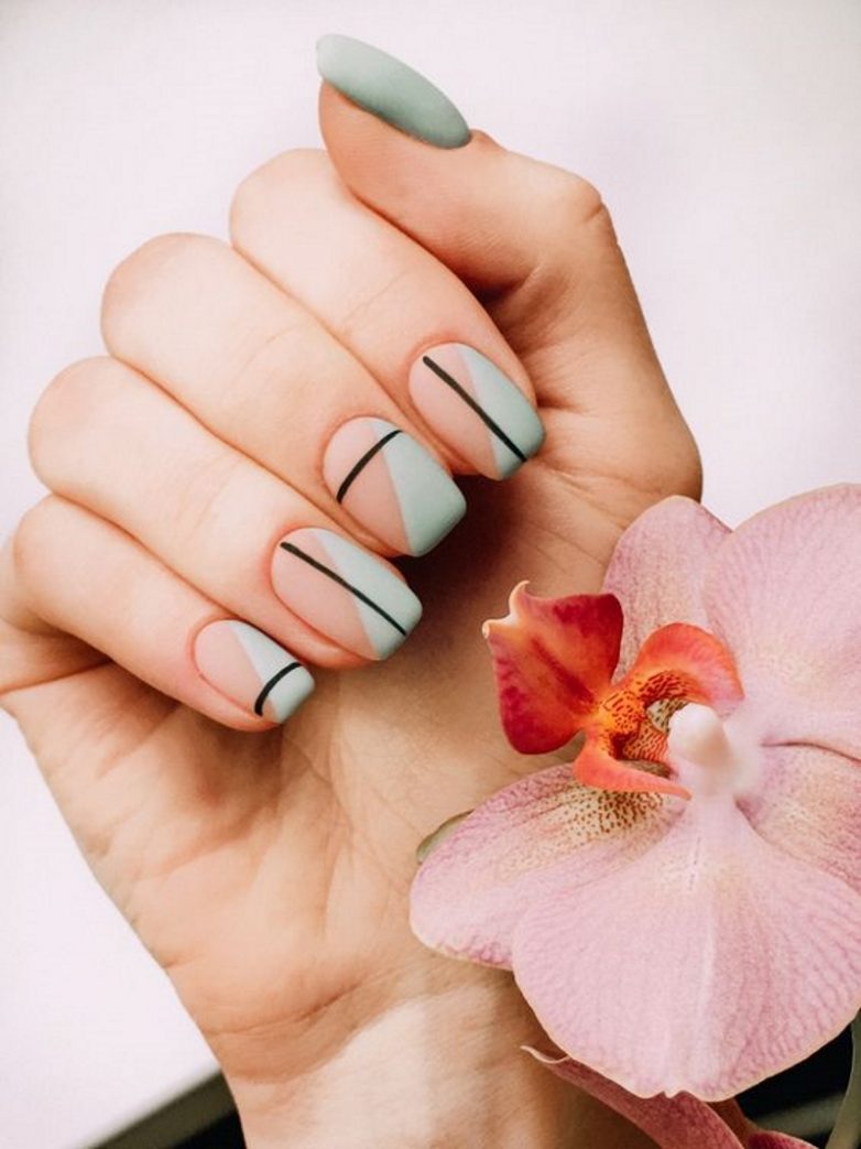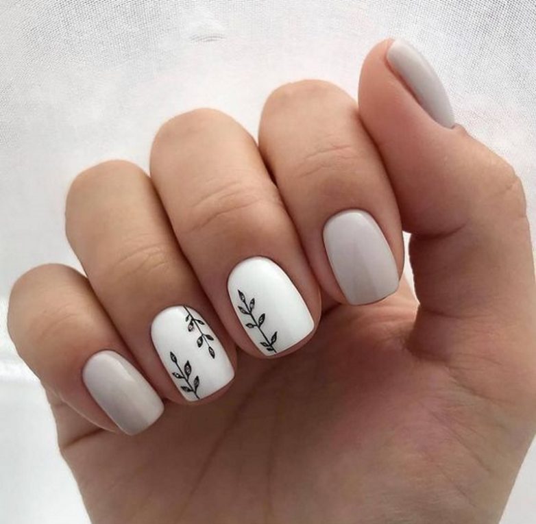 Чтобы сделать стильный летний маникюр, нет необходимости выдумывать сложные узоры, достаточно двух оттенков пастельного лака и небольшого декора в виде милой веточки.