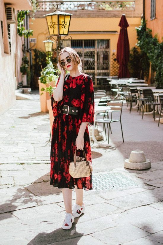 3. красное платье + кроссовки и соломенная сумка